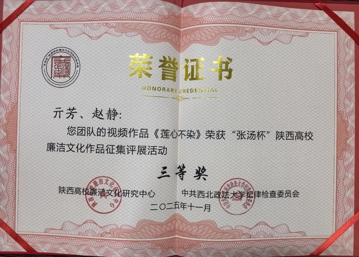 近日,在陕西高校廉洁文化研究中心与西北大学纪委联合主办的“张汤杯”陕西高校廉洁文化作品评选活动中,西安理工大学基建处党支部参评的短视频《莲心不染》荣获视频类三等奖。